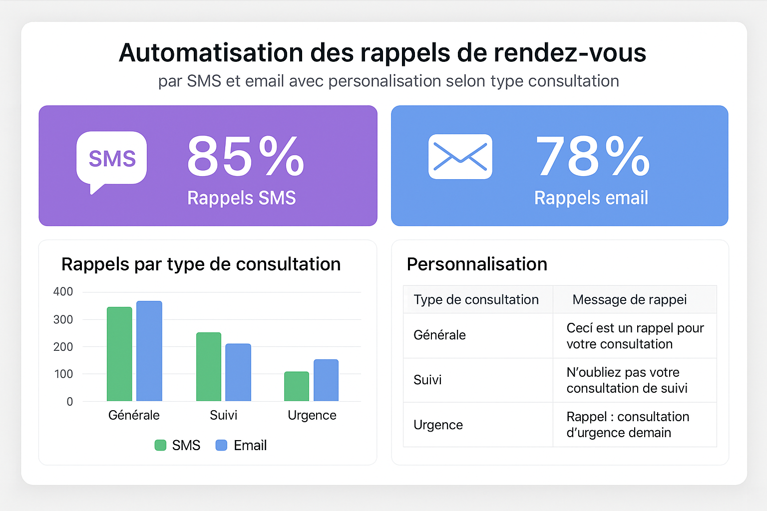 Automatisation des rappels de rendez-vous par SMS et email avec personnalisation selon le type de consultation